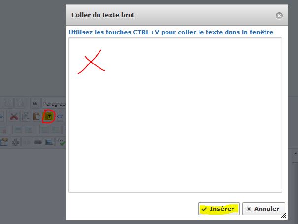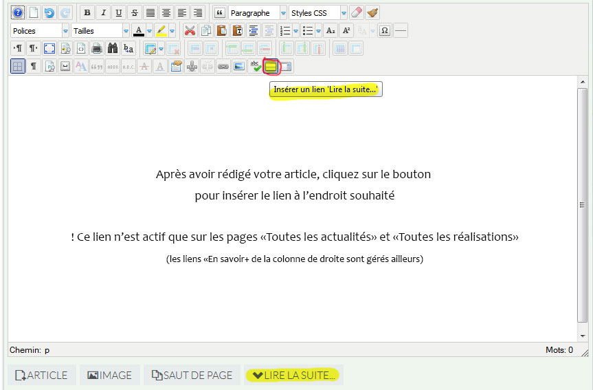 > Tapez votre texte dans l'éditeur ou Coller votre texte depuis Word en utilisant l'outil "Coller du texte brut" (1). Pour les longs articles d'actualité, vous pourvez insérer un lien "Lire la suite" (2) : après avoir mis en page l'article, positionnez votre curseur à l'endroit ou vous souhaitez placer la coupure et cliquez sur le bouton "Lire la suite" situé sous la fenêtre de l'éditeur ou dans la barre d'outils.
