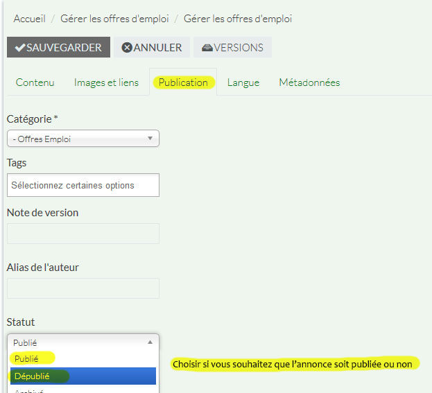Cliquer sur l'article à modifier (5) / ou l'article à dépublier - Effectuer vos modifications, modifier le statut "Publié" ou "Dépublié" dans l'onglet "Publication" (6) - Sauvegardez